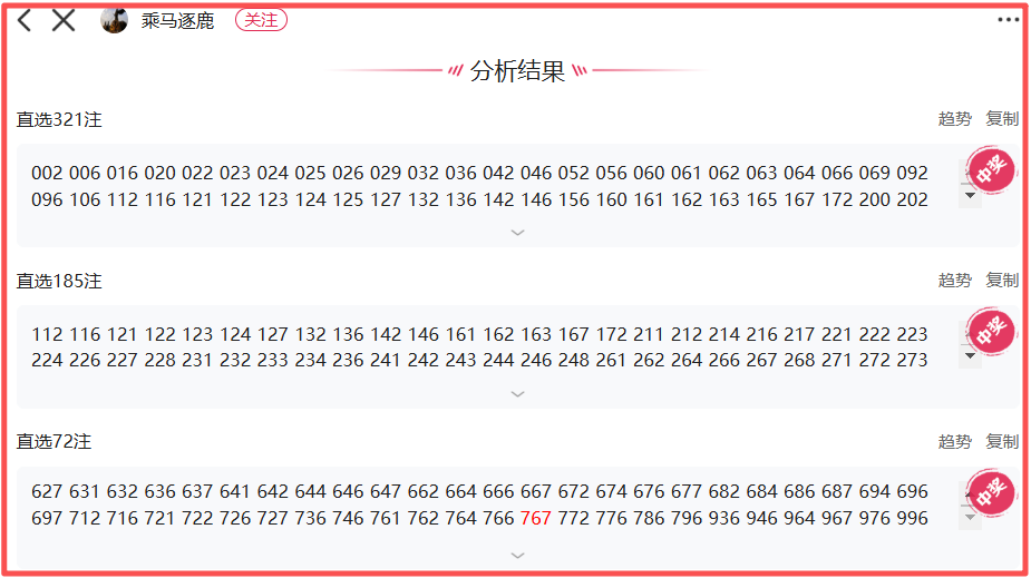 分析师“乘马逐鹿”正是抓住了这一规律,从热趋势中筛选条件,为3组大底的全中筑牢了根基,也让选号从“碰运气”变成了“有方向”的精准出击。