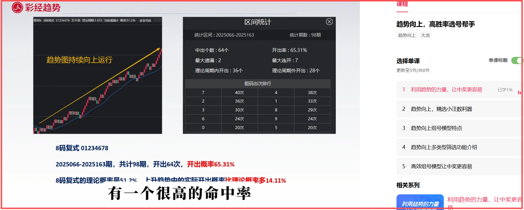《大底精讲训练营》的课程核心围绕彩经趋势软件的“趋势向上”特色功能展开,课程会聚焦彩经趋势软件“趋势向上”特色功能,教大家通过结合软件中的各类指标与容错系统,构建300+至700+注的组号模型,助力掌握高胜率稳定大底的制作方法。