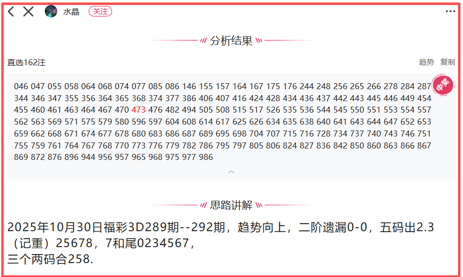 在昨天的中奖榜单中,玩家“水晶”就成了鲜活例证,他沿用“趋势向上组号模型”,以5码出23计重、7和尾、3个两码合为核心条件,顺利拿下3D奖号。