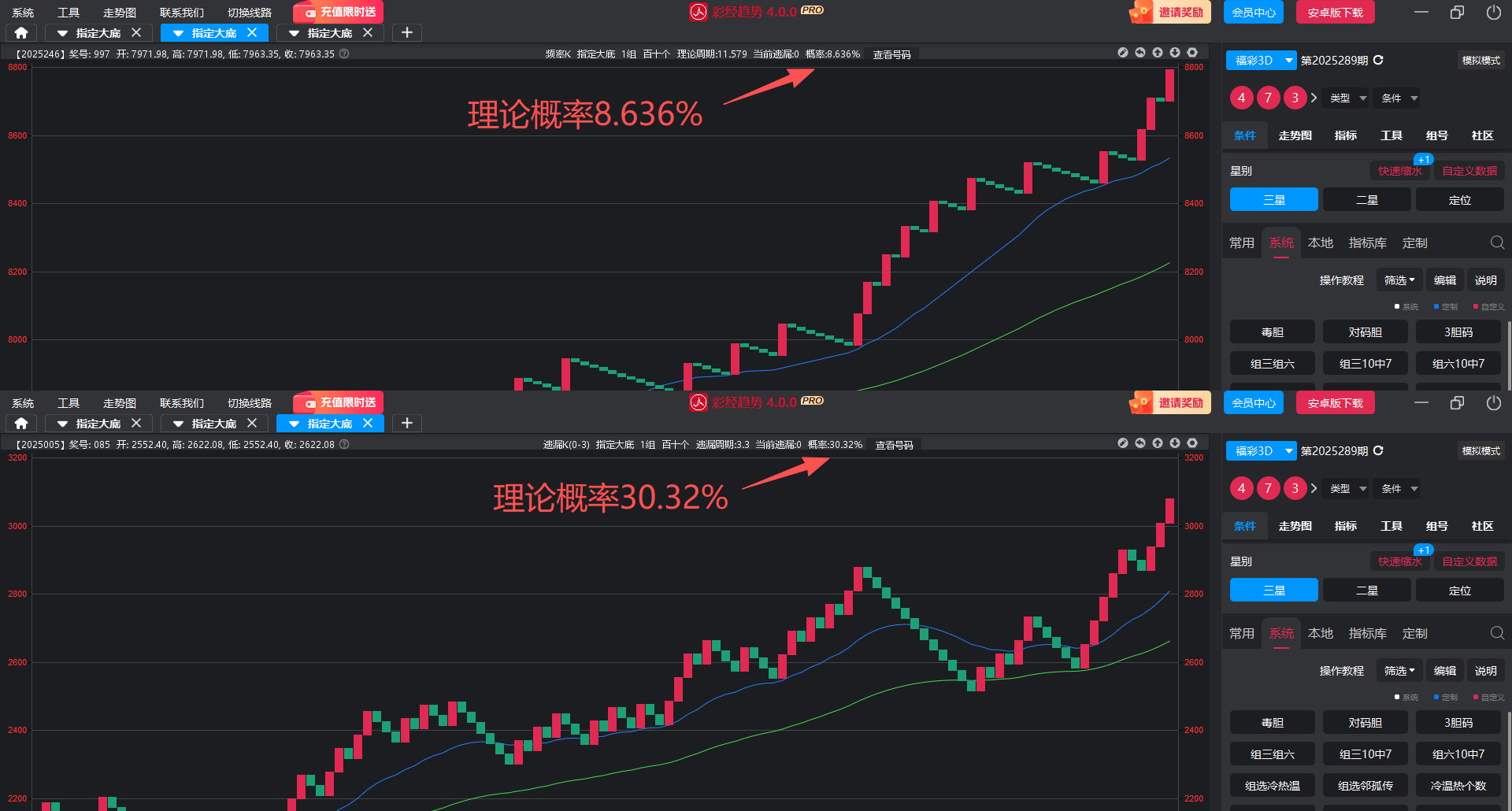 为何这三个条件能成为“常胜将军”?拆解来看,其背后藏着“双高”优势:一是理论开出概率亮眼,5码出23计重、7和尾、3个两码合分别达50%、70%、65.8%,远超普通条件;二是筛选渠道靠谱,它们均由彩经趋势软件“趋势向上”功能系统选出。