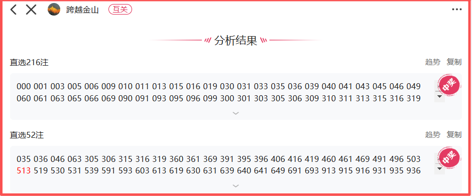 正如此前所说,当每个条件都自带高开出潜力,它们相互叠加后,整体中奖概率便会水涨船高。这就像为选号搭建了稳固的基石,让52注直选不再是“盲目拼凑”,而是有科学概率支撑的精准出击。不过,这仅是基础组号思路,具体选号方法仍需进一步挖掘。