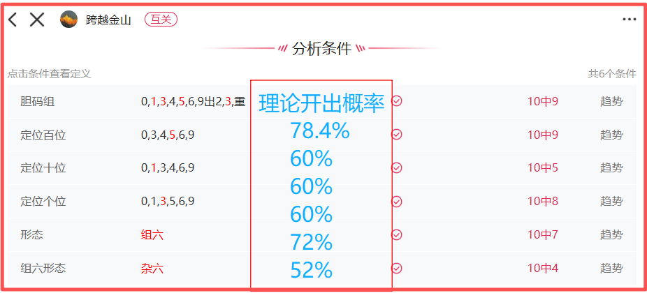 细究“跨越金山”的中奖逻辑,第一步便抓住了“概率”关键。他发布的选号条件均属高概率范畴:最低概率达52%,最高更是攀升至78.4%。