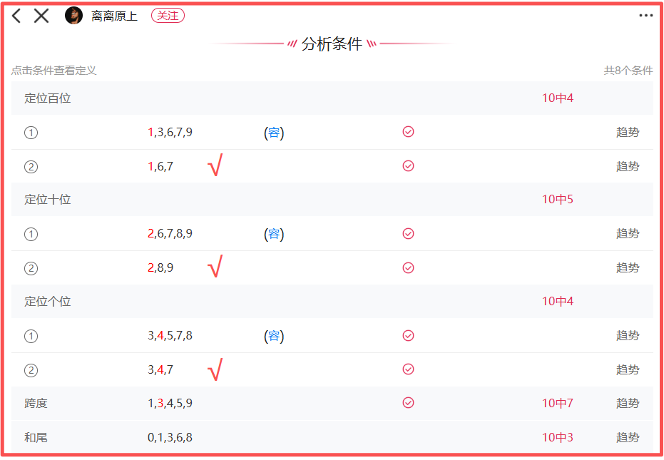 “离离原上”的选号思路,既不盲从工具,也不固守己见。他很巧妙的将自己的选号方法,与彩经趋势软件和二阶遗漏工具融合在一起,在框定基础框架之后,又进行了二次筛选,最终就做出了定位3码复式。