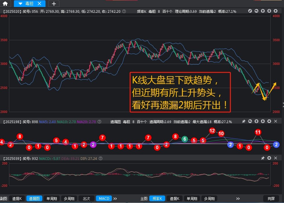 1、今日看好胆码8:K线大盘呈下跌趋势,但近期有所上升势头,看好本期在遗漏2期后开出!