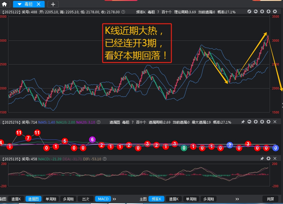2、杀码7:K线近期大热,在连开3期后大热背后必大冷,还是看好本期下跌回落!