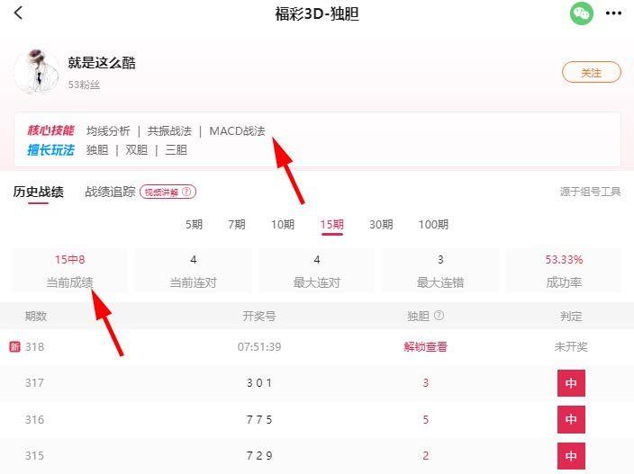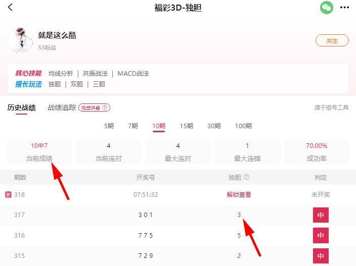 除了昨晚顺利中奖,他近期的战绩也非常亮眼:近10期毒胆命中7期(如上图),70%的超高成功率,每一次出手都自带“稳准狠”的属性。